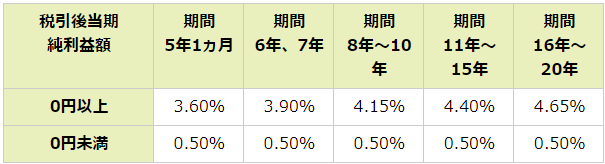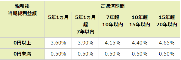 利率は融資後1年ごとに直近の業績に応じて、返済期間ごとに2区分の利率が適用されます。